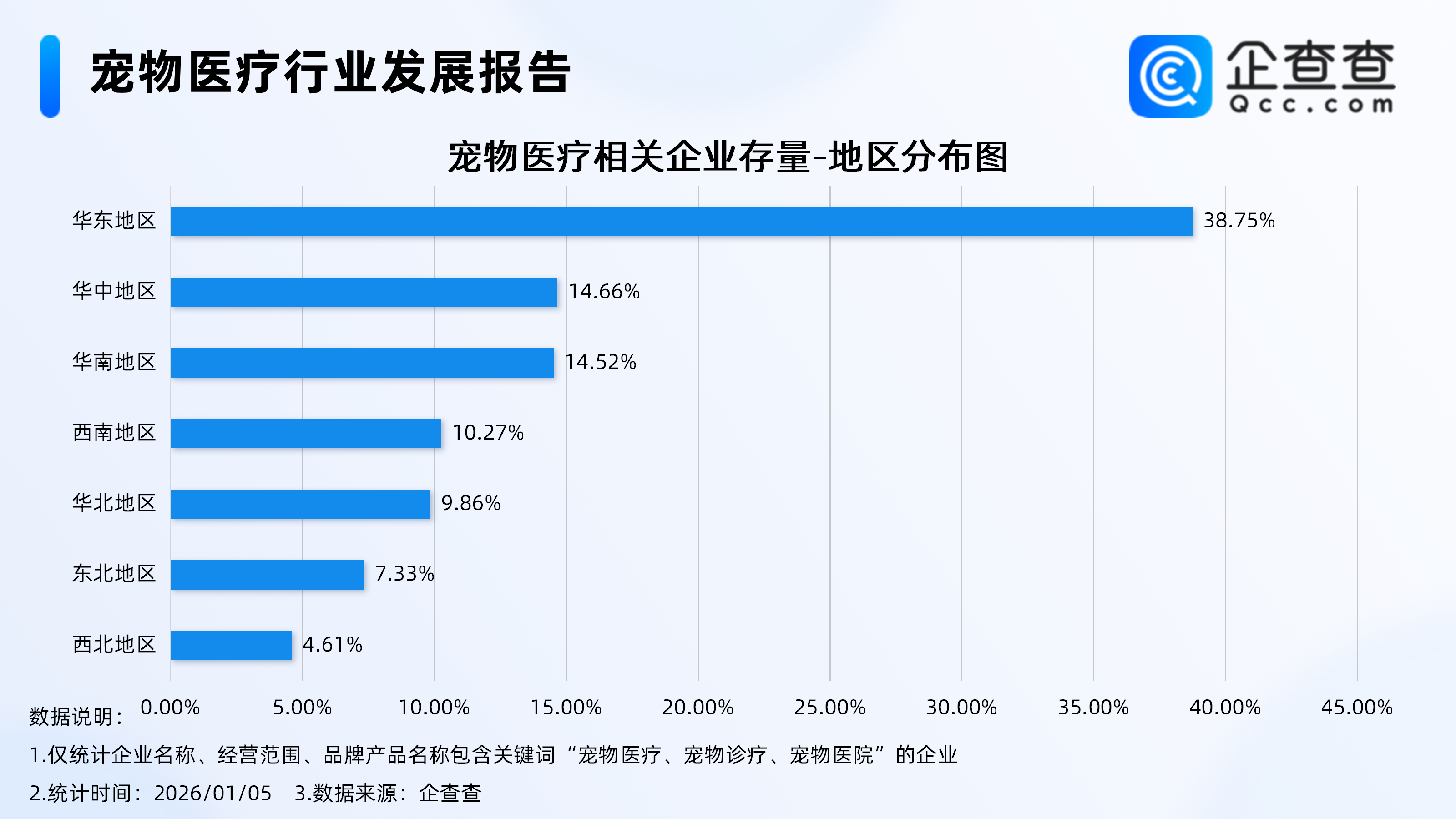 企查查数据显示,从地区分布来看,宠物医疗相关企业主要集中分布在华东地区,占比达38.75%。其次,分布在华中地区、华南地区的宠物医疗相关企业分别占比14.66%、14.52%。
