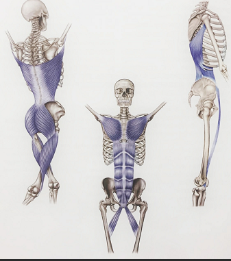 功能链示意图。肌肉的收缩并非仅影响其跨越的关节,而是具有筋膜连续性的,能量得以传递。