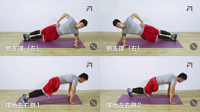 要点:1.俯卧撑姿势支撑,双脚调节至稍靠前支撑;2.腹部发力维持稳定,向左、向右重复跳跃