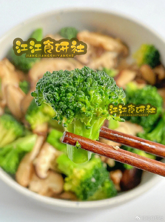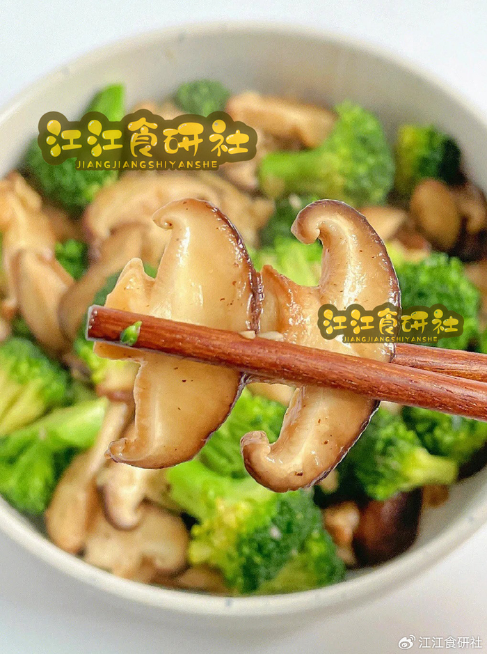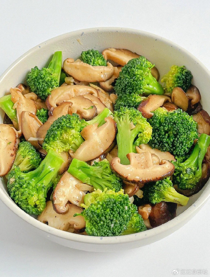 西兰花软黄,香菇水汪汪。