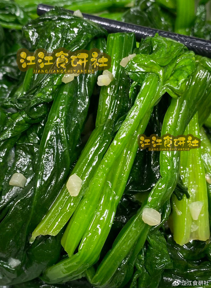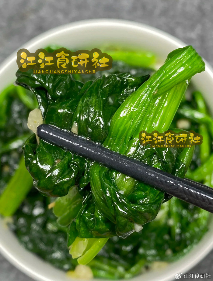 菠菜油亮翠绿,蒜香浓郁。
