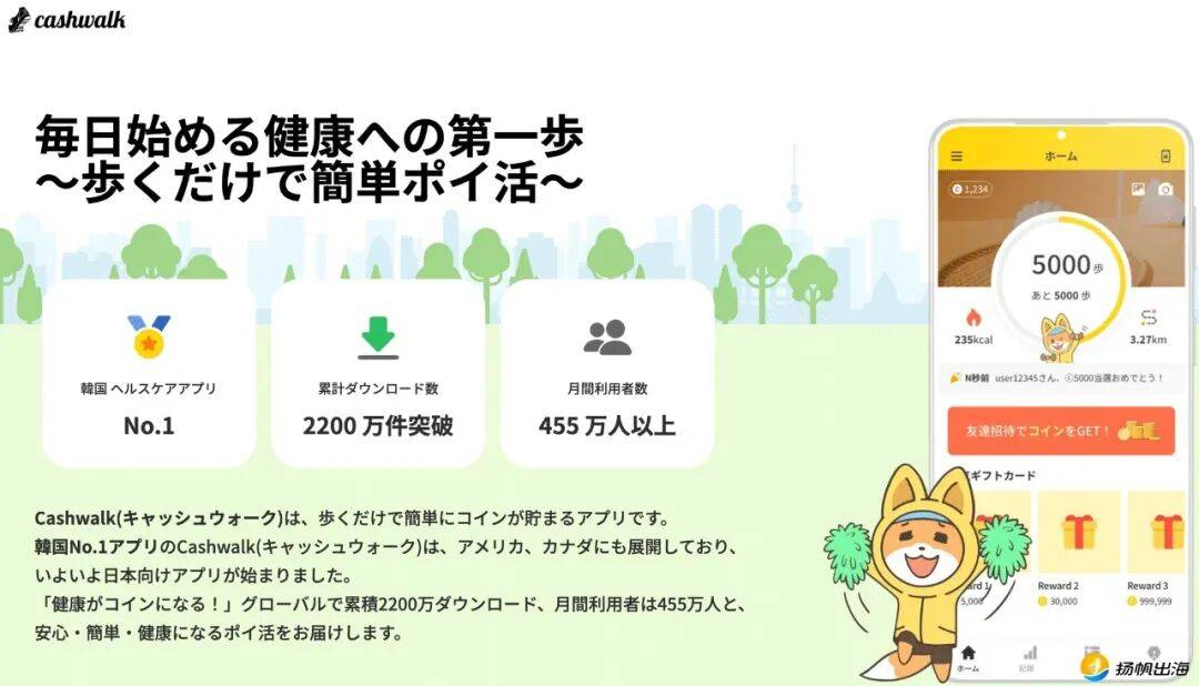Cashwalk则设计了卡通狐狸形象,以更加明亮的色调、更正向的激励来鼓励用户参与运动,值得一提的是,Cashwalk的目标设置为10000步/日,且每走100步都会有一个硬币奖励,单日最多可累计100点积分。这种长线目标+小节点结合的方式更契合日本用户的使用习惯。