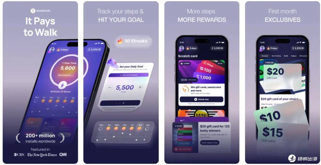 在美国,这类应用的崛起伴随着资本市场的追捧。Sweatcoin上线于2016年,是继STEPN之后又一在全球范围内引领了“Move-to-Earn”这一玩法形式的产品。